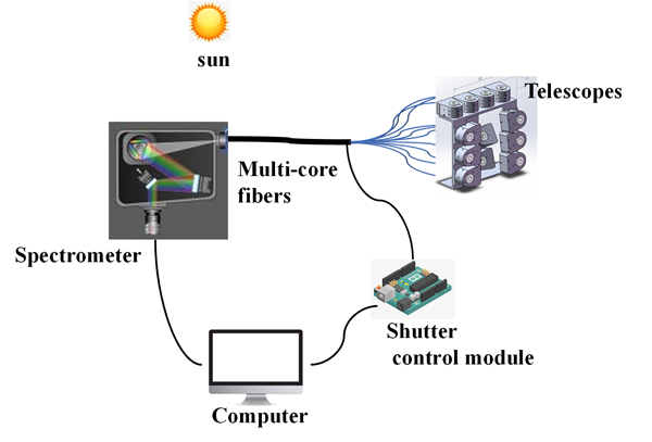 ?團(tuán)隊(duì)基于離軸多路光譜遙測(cè)的思想,采用科研級(jí)CCD成像光譜儀,自主設(shè)計(jì)的小視場(chǎng)角望遠(yuǎn)鏡、Y型同軸分束光纖、多路機(jī)械快門控制模塊實(shí)現(xiàn)了分鐘級(jí)同步多軸的光譜采集,突破了以往多軸差分吸收光譜(MAX-DOAS)系統(tǒng)的采集時(shí)間分辨率限制。研究成果有望成為車載移動(dòng)平臺(tái)大氣監(jiān)測(cè)的核心設(shè)備,為大氣污染監(jiān)測(cè)和污染源溯源研究提供有力支持。