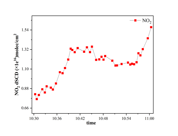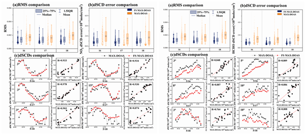 ?研究團(tuán)隊(duì)采用多仰角同步采集的方式取代了單鏡頭順序采集,構(gòu)建了一套地基、車載均適用的同步多軸遙測(cè)系統(tǒng),實(shí)現(xiàn)了一個(gè)循環(huán)仰角光譜的分鐘級(jí)探測(cè),如圖2所示,傳統(tǒng)MAX-DOAS的系統(tǒng)分辨率一般為七分鐘,新系統(tǒng)極大提升了采集時(shí)間分辨率。在外場(chǎng)試驗(yàn)中,同步多軸系統(tǒng)與MAX-DOAS、LP-DOAS系統(tǒng)同期觀測(cè)的結(jié)果如下:在DOAS方法反演痕量氣體斜柱濃度中,RMS、dSCD誤差是衡量濃度準(zhǔn)確性的重要指標(biāo),同步多軸系統(tǒng)反演NO2、HCHO的RMS、dSCD誤差均低于MAX-DOAS,兩系統(tǒng)反演NO2、HCHO濃度的相關(guān)性分別為0.978和0.850,由于提高了時(shí)間分辨率,同步多軸系統(tǒng)反演的氣體廓線結(jié)果比MAX-DOAS的更細(xì)致;NO2近地面濃度對(duì)比實(shí)驗(yàn)中,同步多軸系統(tǒng)與LP-DOAS系統(tǒng)測(cè)得的數(shù)據(jù)相關(guān)性高達(dá)0.901。后續(xù)同步多軸系統(tǒng)將繼續(xù)拓寬其在高時(shí)間分辨污染氣體立體分布遙感領(lǐng)域的應(yīng)用,發(fā)揮其多仰角多組分同步監(jiān)測(cè)的優(yōu)勢(shì)。