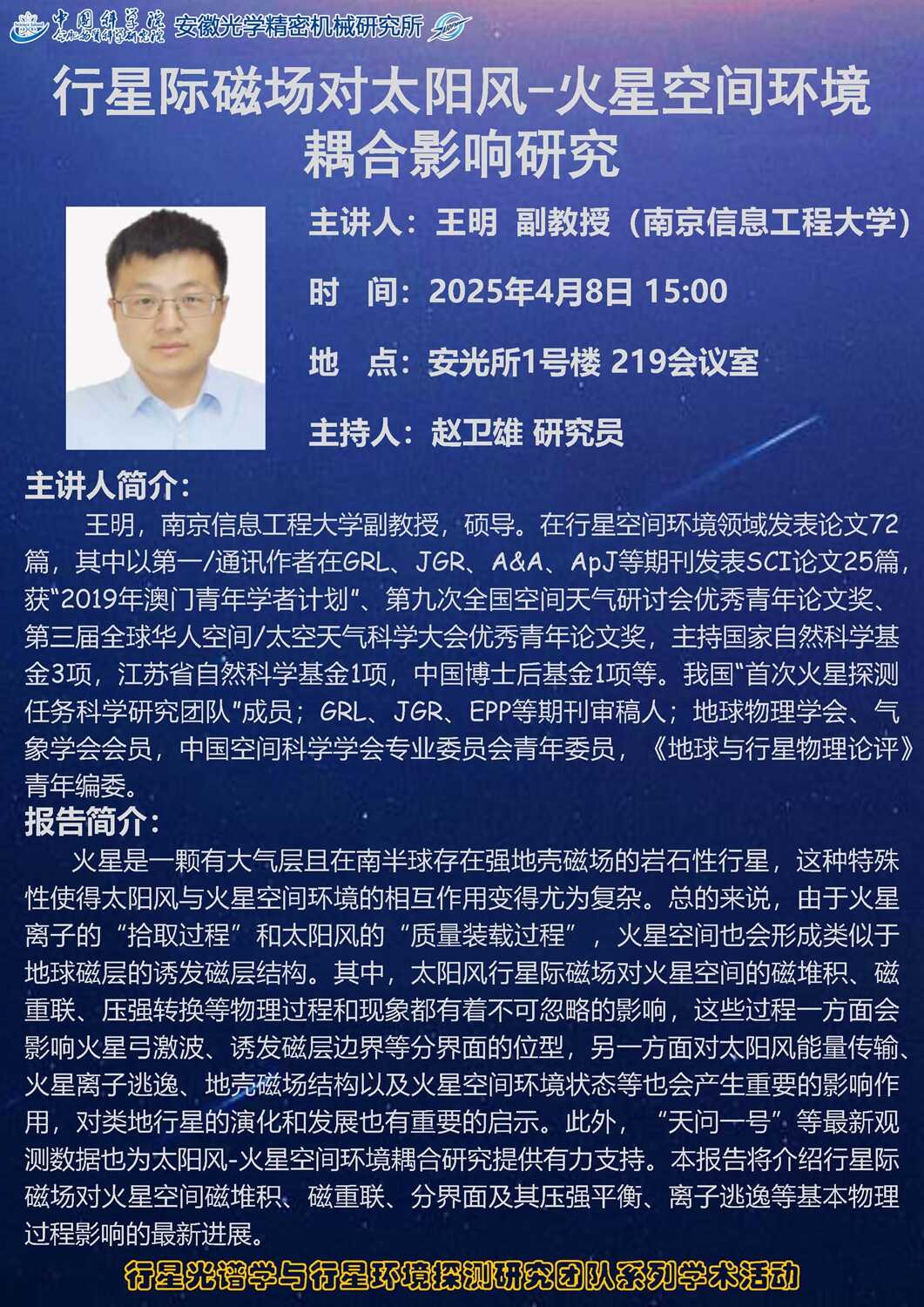 行星光譜學(xué)與行星環(huán)境探測研究團(tuán)隊系列學(xué)術(shù)活動:行星際磁場對太陽風(fēng)-火星空間環(huán)境耦合影響研究(4.8)