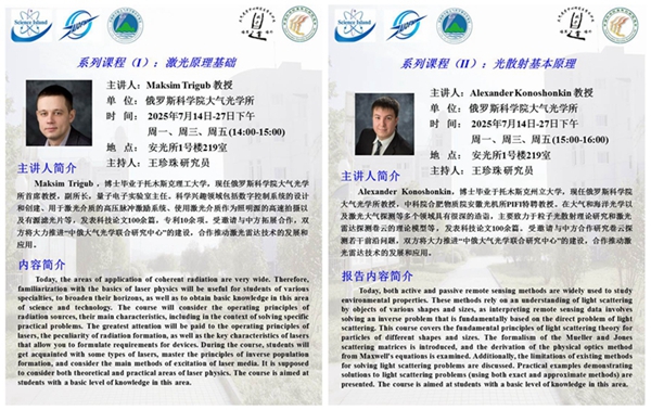 7月14-25日,應安光所大氣光學中心王珍珠研究員邀請,俄羅斯科學院大氣光學所副所長馬克西姆·特里古布(Maksim Trigub)教授和亞歷山大·科諾申金(Alexander Konoshonkin)教授訪問安光所,并為中俄大氣光學聯合研究中心科研人員、青年學者集中教學光散射基本原理和激光原理基礎等國際課程。